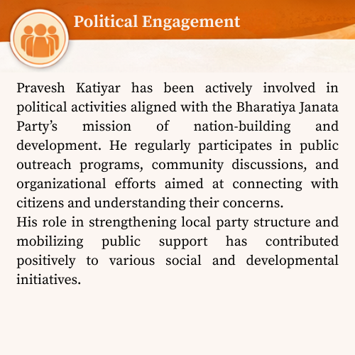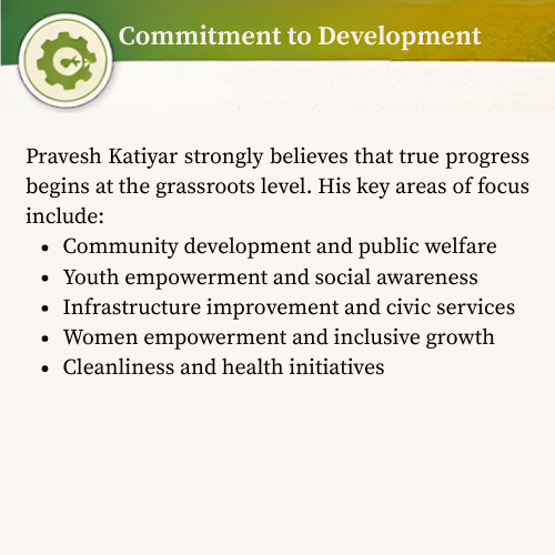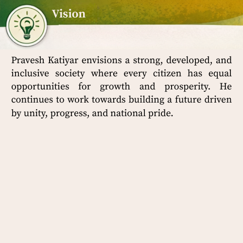 Driven by the vision of a developed and self-reliant India, Pravesh Katiyar believes in transparent leadership, social harmony, and sustainable progress. His approach reflects a deep commitment to serving citizens with integrity and responsibility.