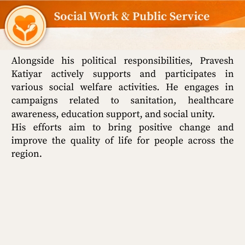 Parvesh Katiyar also serves as a Zila Panchayat Member, representing the voices of the people and working tirelessly to address their needs. His focus areas include rural development, education, healthcare, cleanliness, employment generation, and the effective implementation of government welfare schemes.